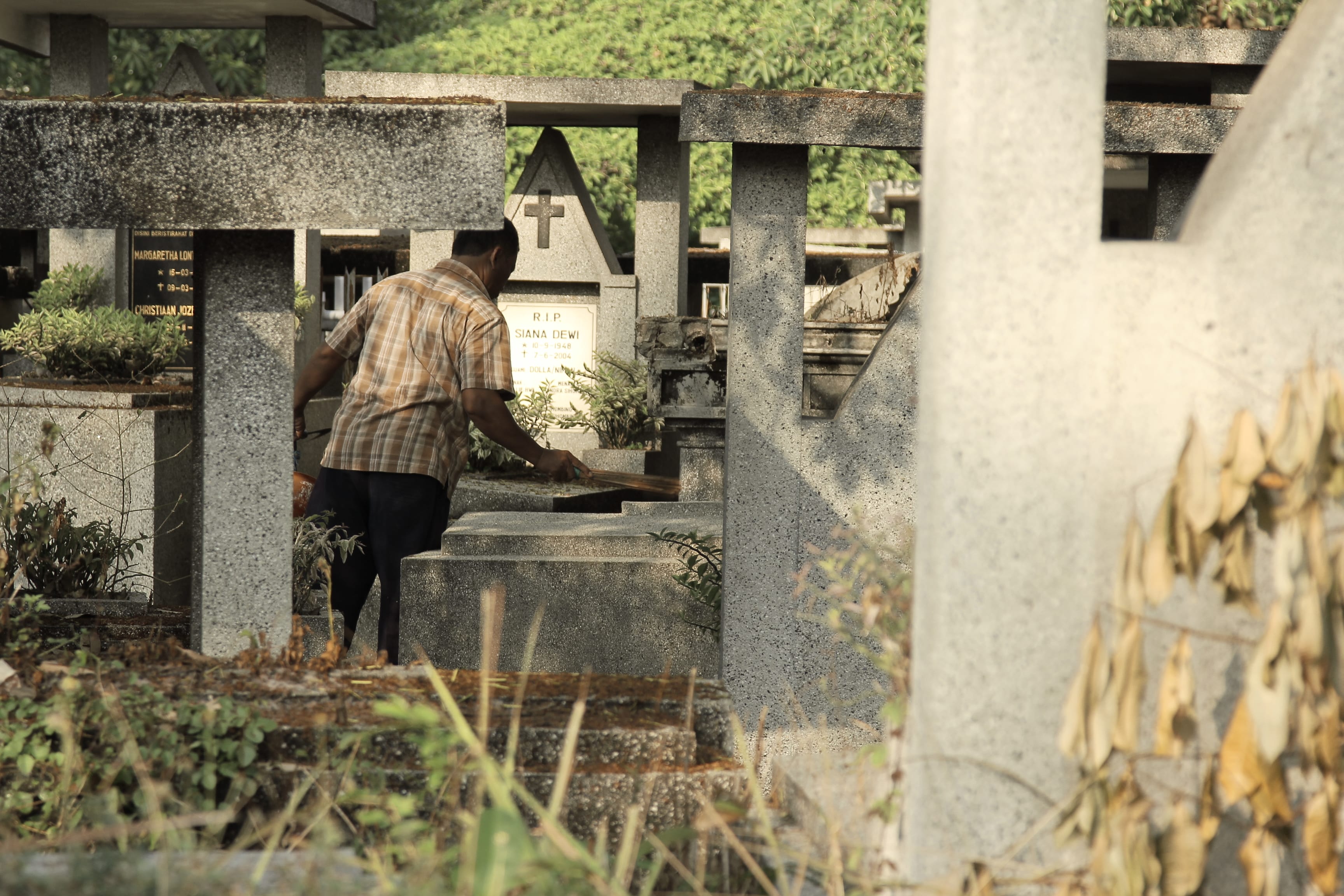 Tak berbeda dari juru rawat makam yang lain, Pur juga membawa sapu lidi, arit dan botol kosong. Seperangkat peralatan untuk merawat makam-makam yang dipercayakan kepadanya. Menjadi juru rawat makam sudah menjadi pekerjaan yang dilakoninya sejak puluhan tahun lalu. Bahkan kini, Pur dipercaya untuk merawat 232 makam di komplek pemakaman Kembang Kuning Surabaya.