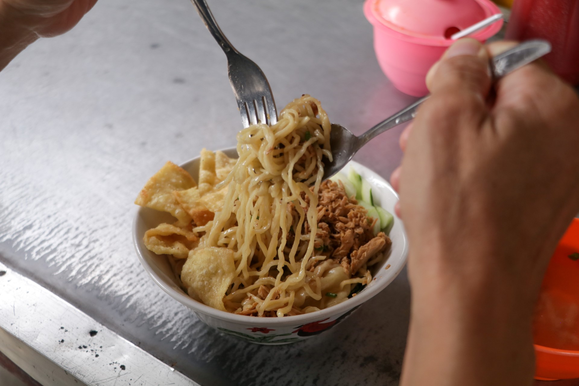 Seorang pelanggan menikmati masakan mie yang telah dibuat Pak Hasan.