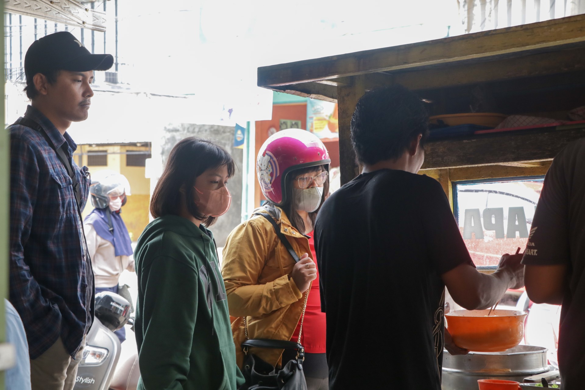 Pelanggan mengantri untuk memesan dan mengambil mie pangsit Palapa.