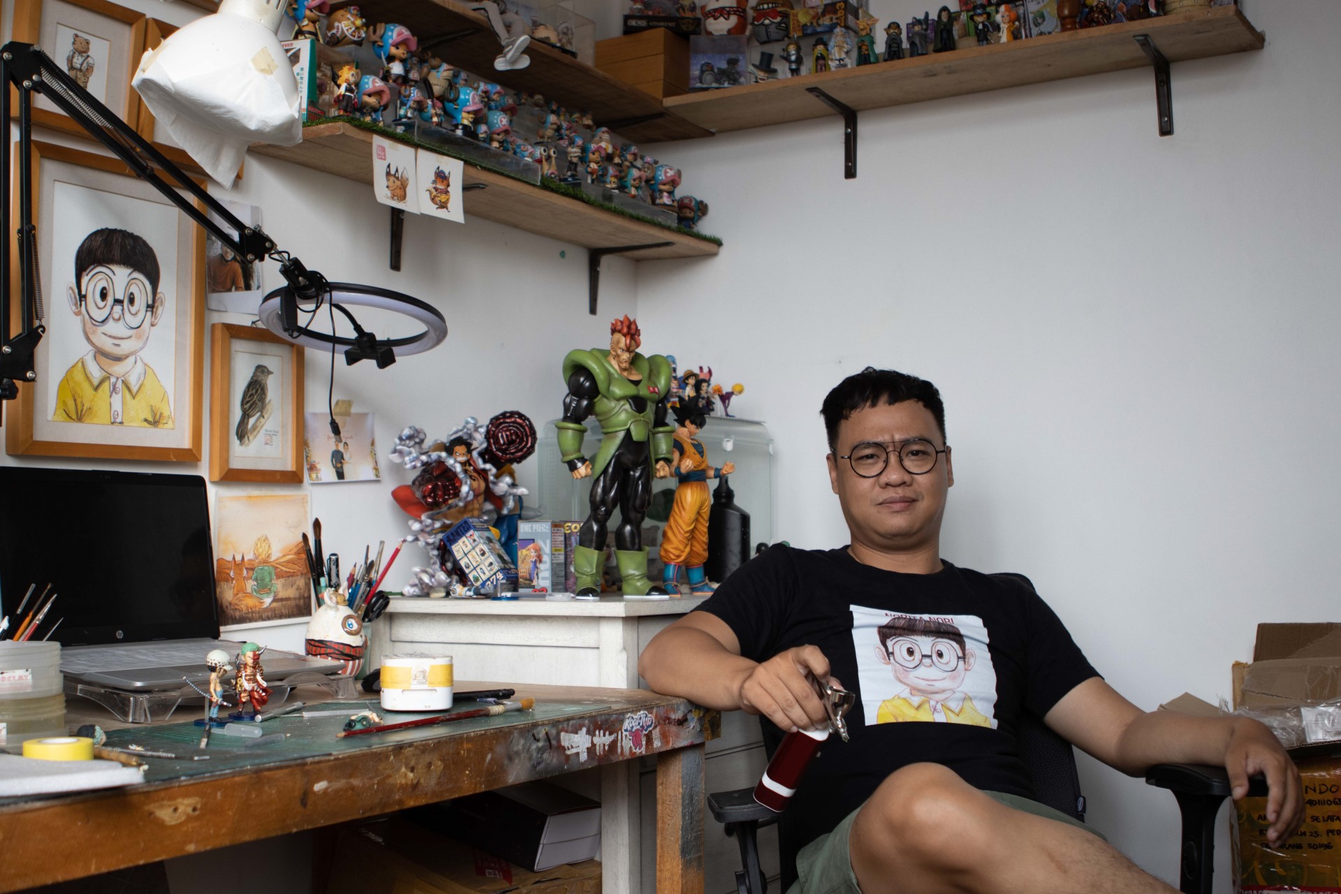 Cyndo yang sedang berpose di ruang kerja dengan koleksi figur karakternya.