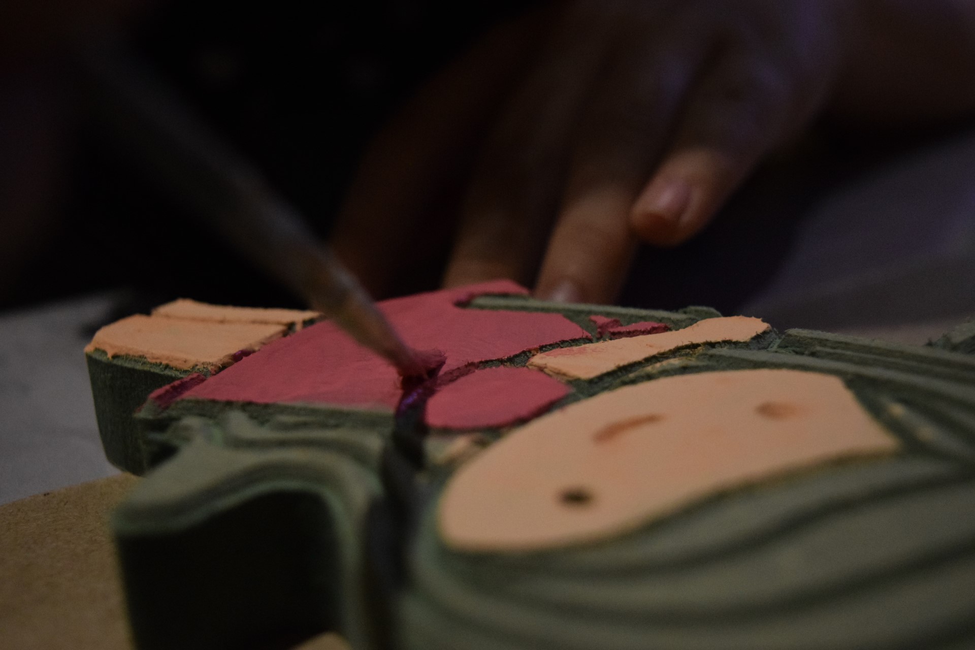 Potret kebersamaan antara seorang ibu dan anak saat sedang mewarnai patung kayu.