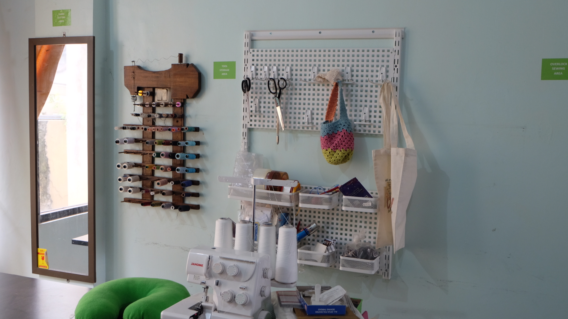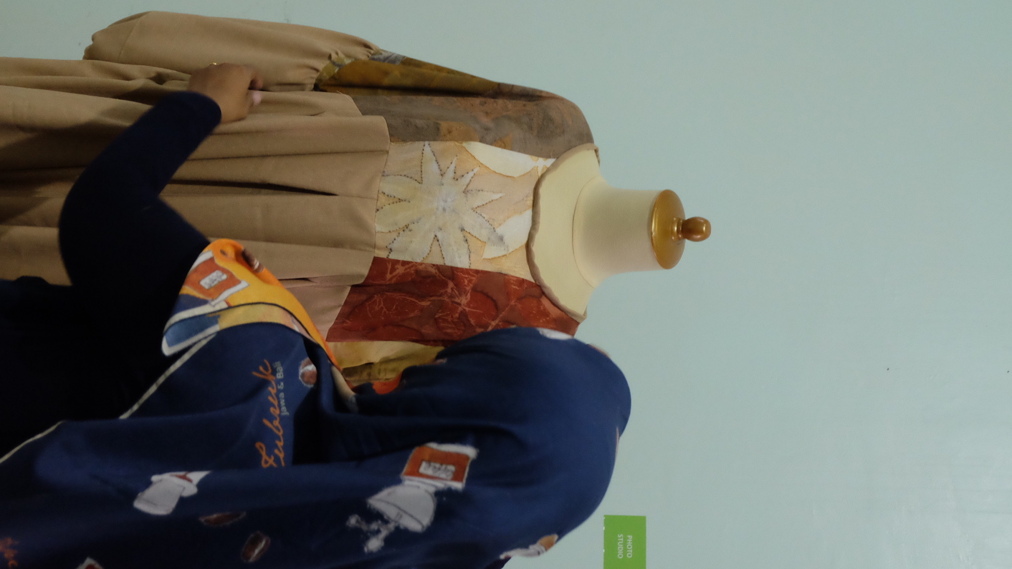 Bu Eka memeriksa kembali karya baju dari kain bekas.