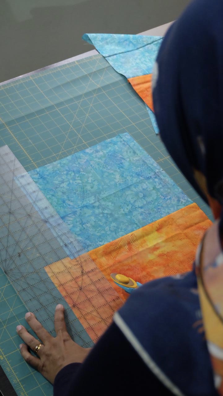 Bu Eka memotong kain untuk membuat karya sarung bantal.