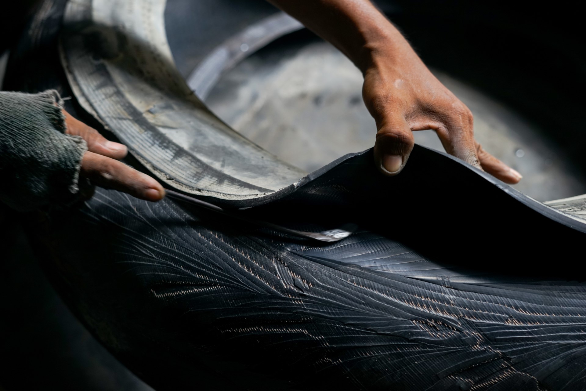 Umar menguliti ban bekas menggunakan celurit untuk diambil lapisan karetnya.