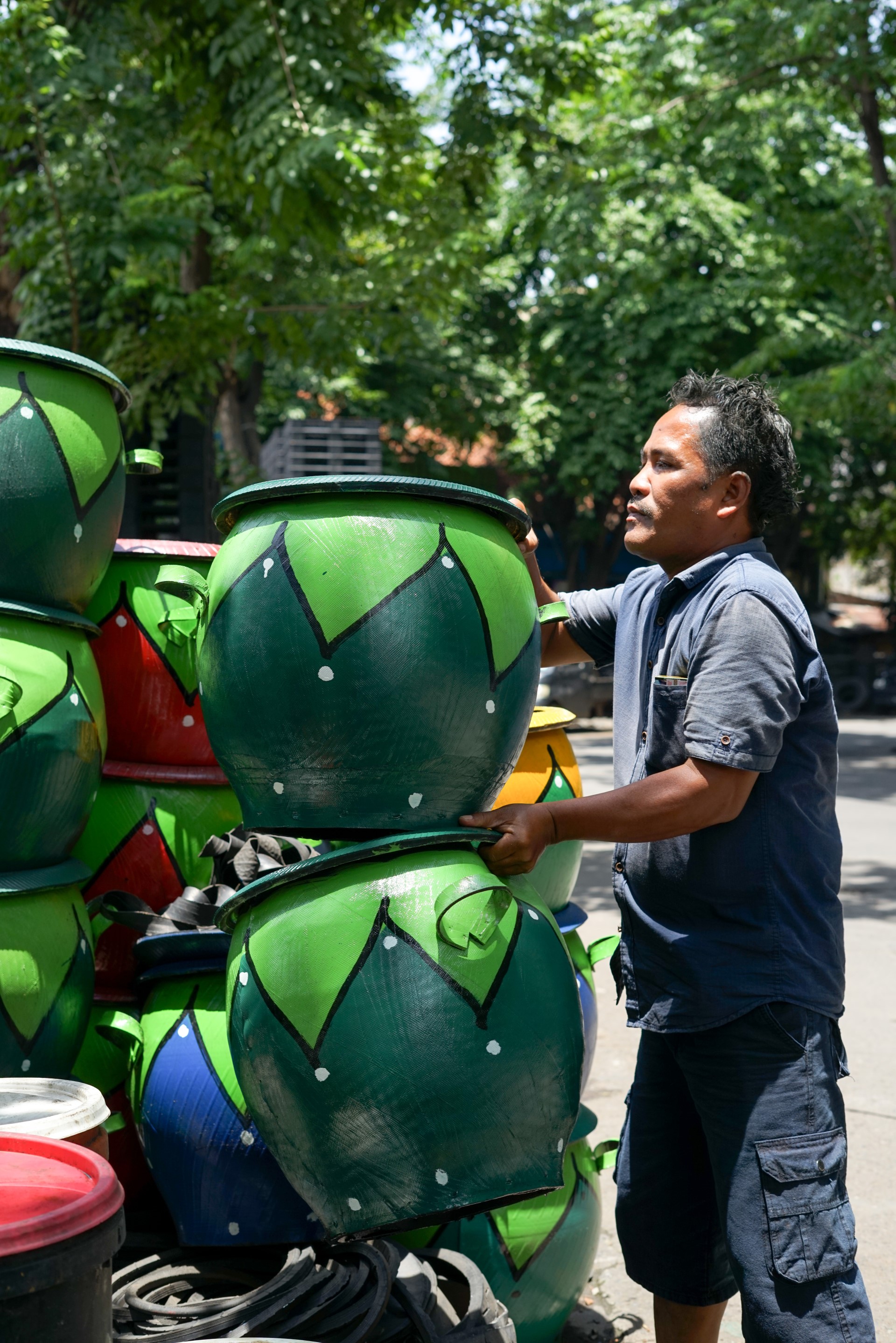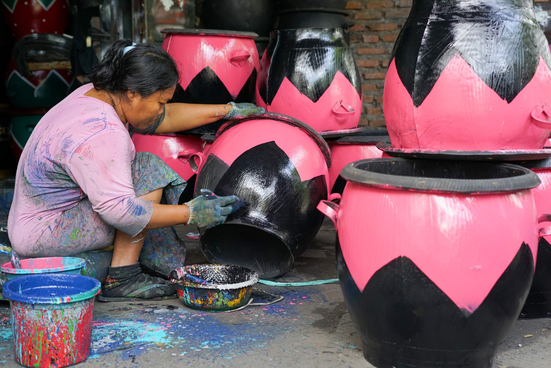 Potret salah satu pekerja menyusun bak yang sudah selesai diwarnai.