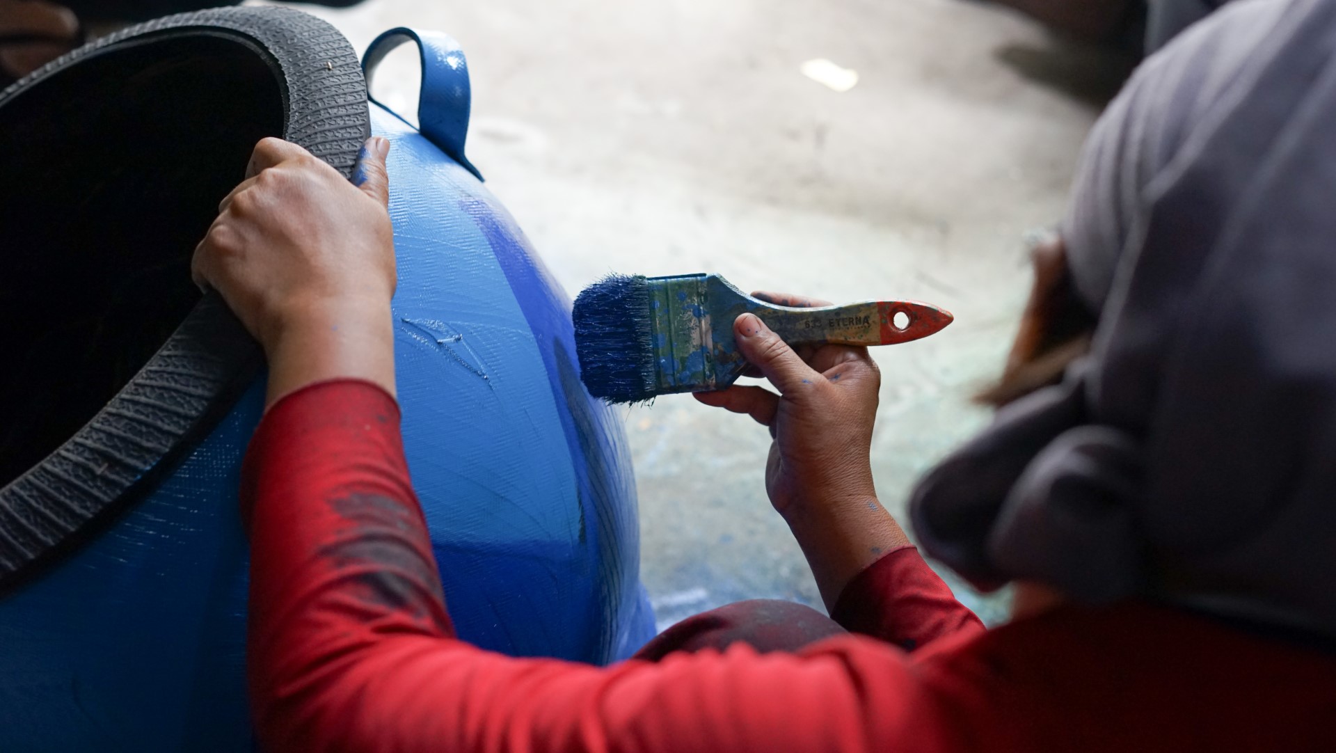 Tangan salah satu pengrajin memoles bak sampah dengan kuas halus.