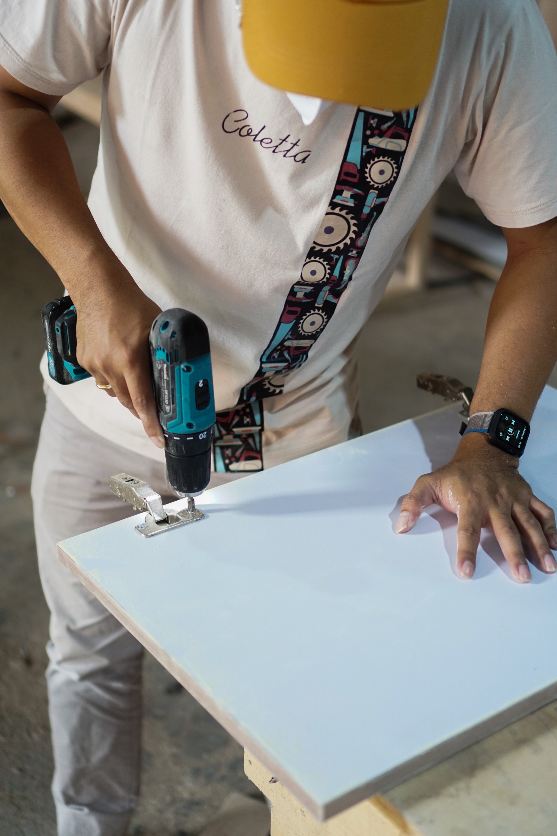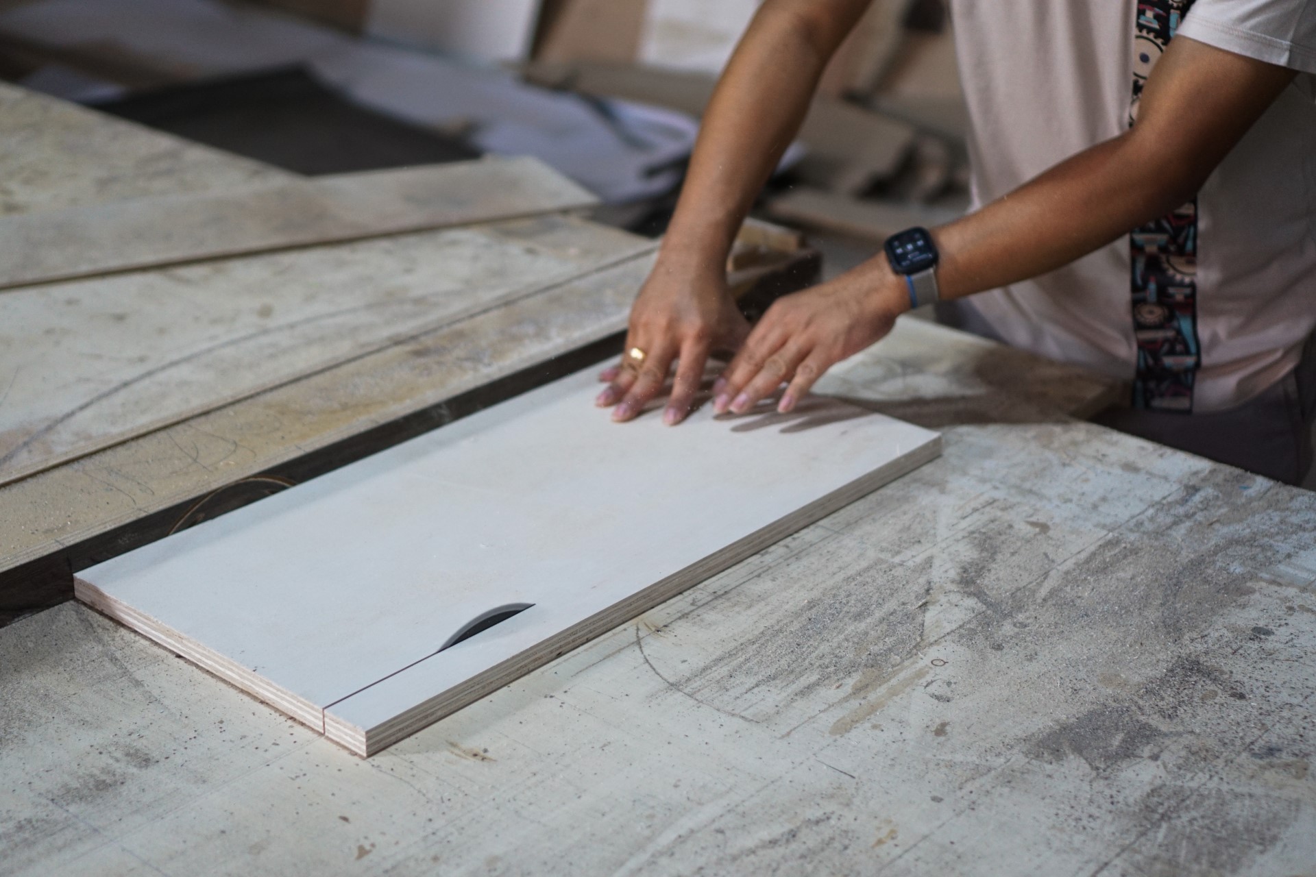 Virgo memotong papan kayu untuk laci sebuah lemari