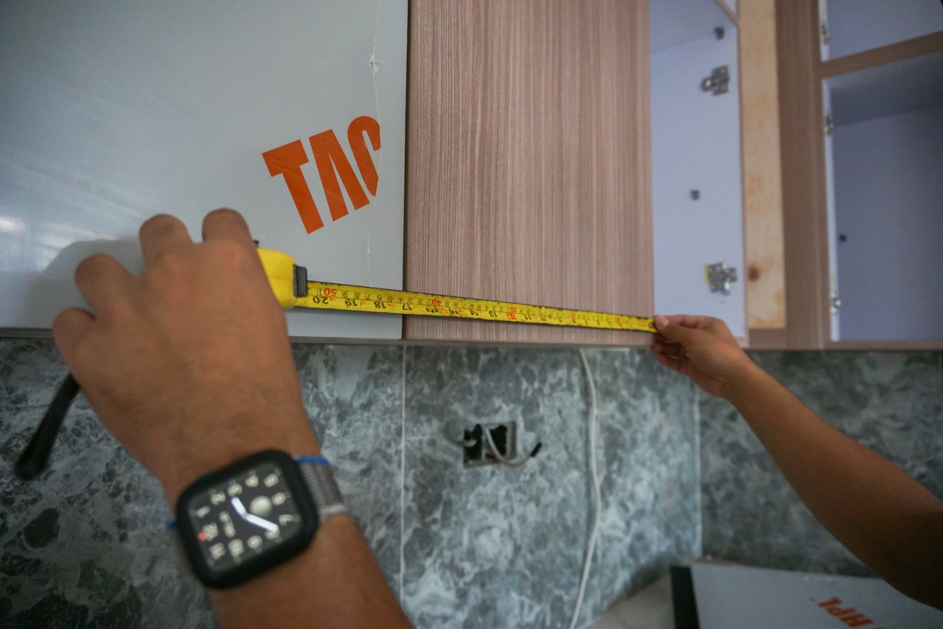 Pemeriksaan ukuran terakhir setelah pintu dipasang pada boks.