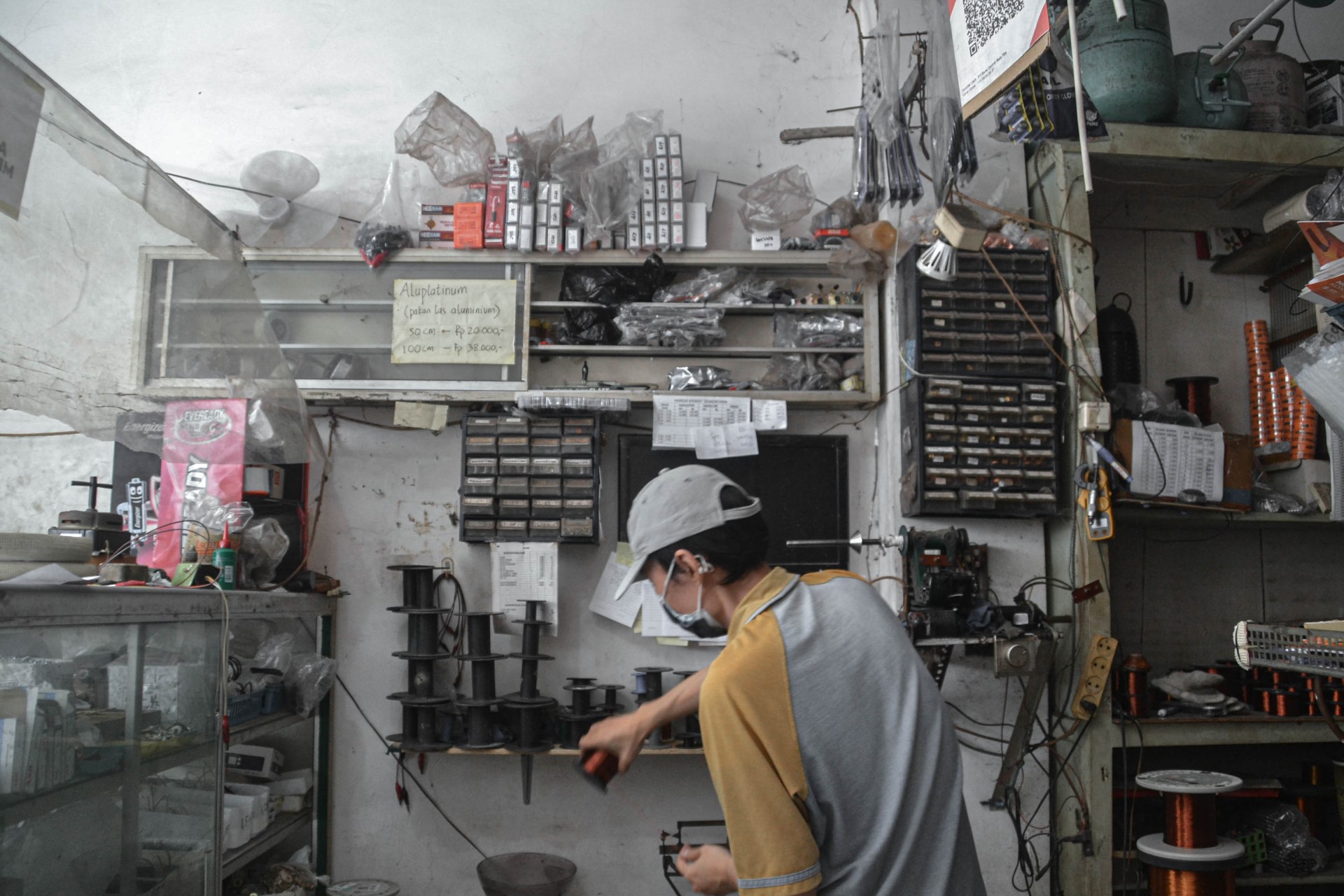 Potongan-potongan suku cadang menghalangi panasnya matahari Sidoarjo dari Budi. Gerah malah menjadi pertanda tokonya akan bertambah ramai. Tak disangka, di saat jalanan semakin sepi karena Work from Home , jam istirahatnya malah sebatas hitungan jari. Kenaikan jumlah pelanggan di masa pandemi didapat dari pengendara kendaraan bermotor yang tertarik karena membutuhkan suku cadang dengan harga yang ramah bagi dompet. Ketika memulai bisnis ini di tahun 2004, Budi hanya menjual barang-barang kecil karena tidak ada persiapan dan pengalaman. Ia juga sedikit khawatir dengan banyaknya persaingan dalam bisnis. Pertarungan harga dengan penjual lain menjadi hambatan hingga saat ini karena profit yang dihasilkan semakin menipis. Untungnya, ia sudah terbiasa dengan gaya hidup yang sederhana sehingga masih bisa mencukupi kebutuhan sehari-hari.